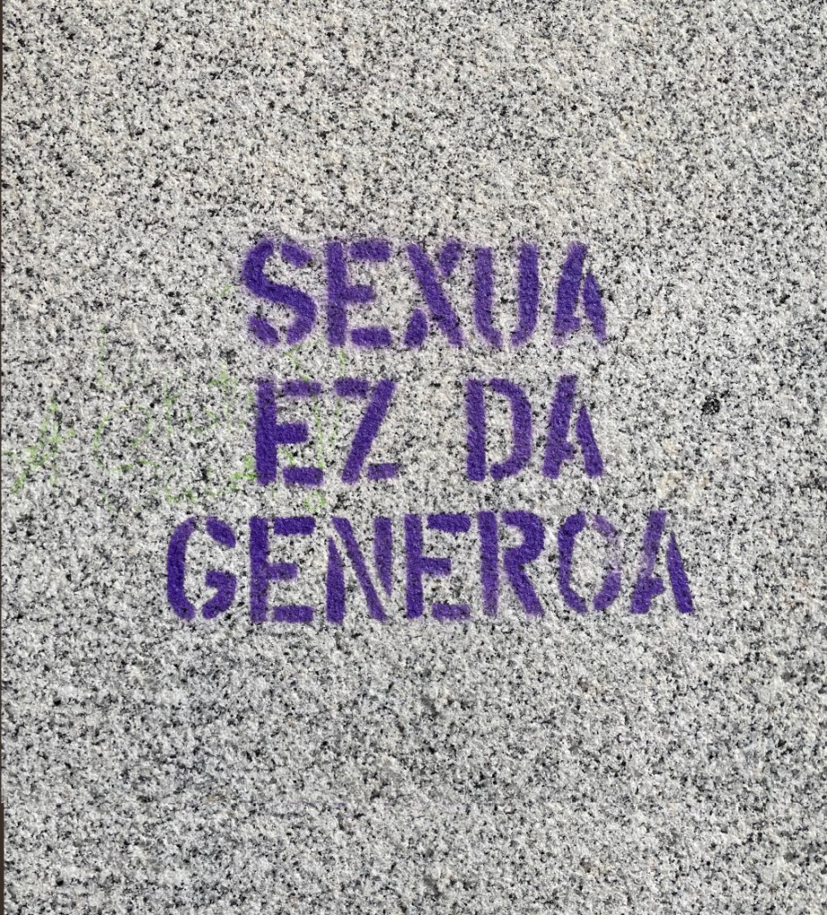 Hace ya varias semanas, aparecieron por las paredes de Bilbao decenas de pintadas como la que tenéis en la foto, hechas con igual plantilla: SEXUA EZ DA GENEROA, rezaban. Lo traduzco, por si acaso: sexo no es género, o quizás el sexo no es el género.