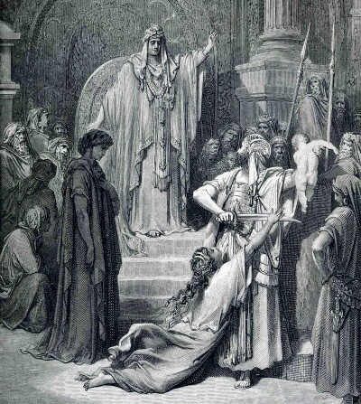 Dos madres recientes se presentaron ante el rey Salomón pidiendo justicia. Una de ellas, mientras dormía y sin querer, había ahogado a su crío. Ambas sostenían que el vivo era el suyo, y el muerto, el de la otra.